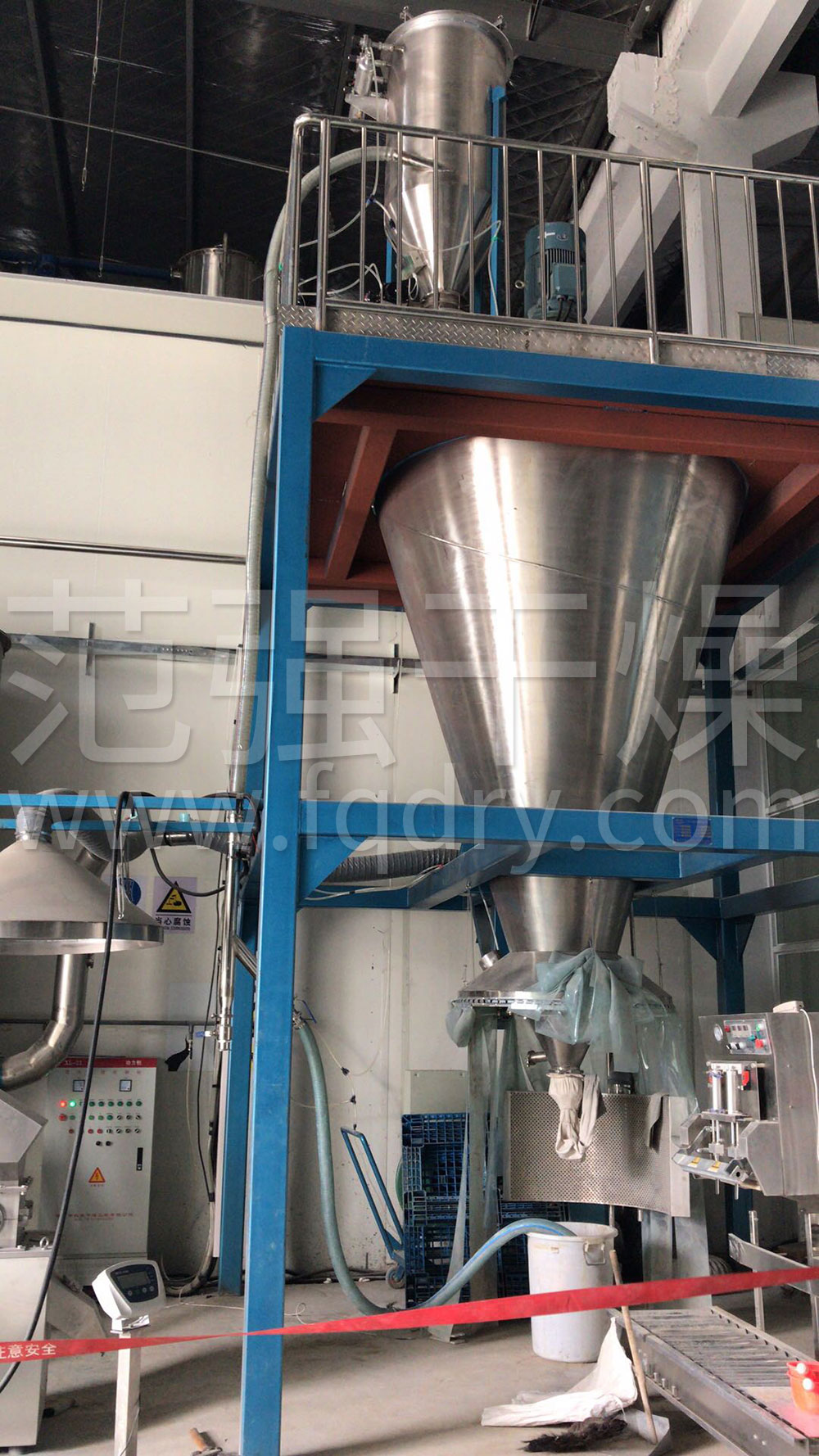 錐形混合干燥機用于傳導(dǎo)傳熱型的干燥裝置時,有優(yōu)良的機能,在壁面上物料不斷更新,使傳熱系數(shù)增大。對食品等物料的干燥時,傳熱系數(shù)可以達(dá)到300~400W/(m2?K)。在上部固定的渦流制動器對進(jìn)行干燥的物料有破碎分散作用。由于物料的轉(zhuǎn)動,仰制了結(jié)塊,使干燥能有效地進(jìn)行,除常壓干燥之外,本身有真空構(gòu)造,進(jìn)行真空干燥的實例也很多。特別對含有機溶劑的濕粉物料干燥,以除去溶劑為目的使用的場合也很多。例如,含有機溶劑的聚合物的干燥,脫除溶劑、從醫(yī)藥品粉末中去除10-6級的甲醇、陶瓷漿的干燥和樹脂粉末的干燥等。在干燥含甲醇(17%)和水的賽璐珞時,它可以作為流化床干燥器的預(yù)干燥用,可以使流化床干燥器在除去甲醇后的爆炸極限以下作業(yè)。