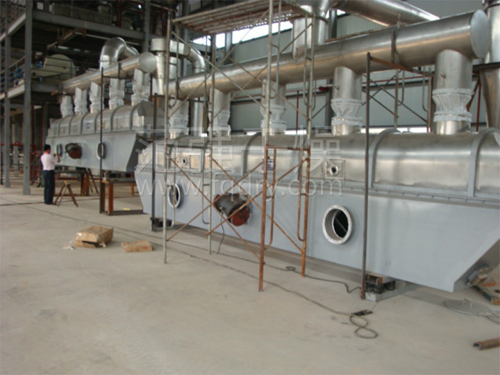 物料自進料進口進入機內(nèi),在振動力作用下,物料沿水平面流化床拋擲,向前連續(xù)運動,熱風向上穿過流化床同濕物料換熱后,濕空氣經(jīng)旋風分離器除塵后由排風1:3排出.干燥物料由排料進口排出。