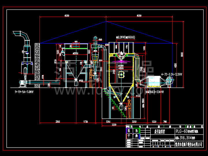 空氣經(jīng)過濾和加熱,進(jìn)入干燥器頂部空氣分配器,熱空氣呈螺旋狀均勻地進(jìn)入干燥室。料液經(jīng)離心噴霧干燥機(jī)塔體頂部的高速離心霧化器,(旋轉(zhuǎn))噴霧成極細(xì)微的霧狀液珠,與熱空氣并流接觸在極短的時間內(nèi)可干燥為成品。成品連續(xù)地由干燥塔底部和旋風(fēng)分離器中輸出,廢氣由風(fēng)機(jī)排空。