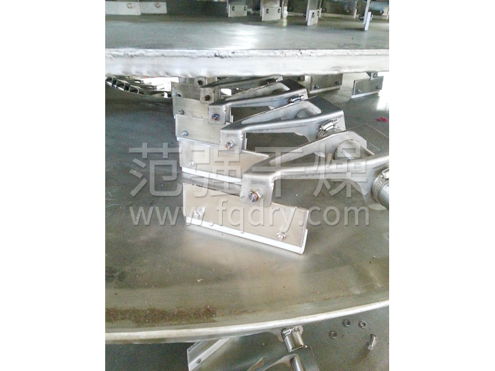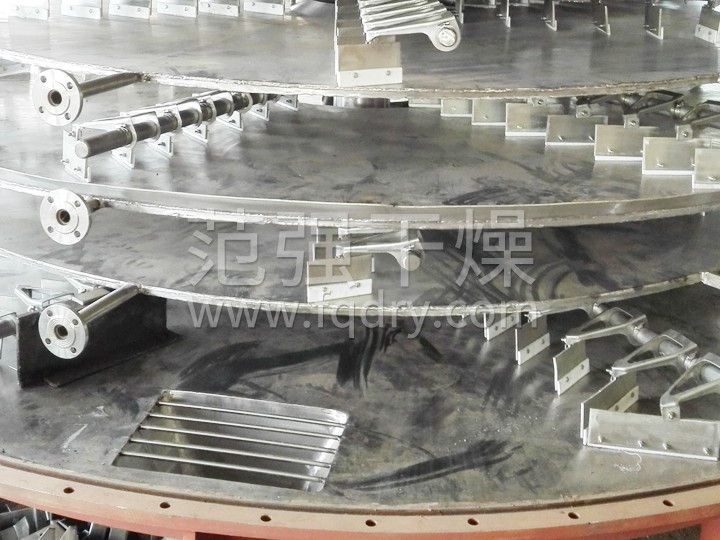 濕物料自加料器連續(xù)地加到盤式連續(xù)干燥機(jī)上部第一層干燥盤上,帶有耙葉的耙臂作回轉(zhuǎn)運(yùn)動(dòng)使耙臂作回轉(zhuǎn)運(yùn)動(dòng)使耙葉連續(xù)地翻抄物料。物料沿指數(shù)螺旋線流過干燥盤表面,在小干燥盤上的物料被移送到外緣,并在外緣落到下方的大干燥盤外緣,在大干盤上物料向里移動(dòng)并從中間落料口落如下一層小干燥盤中。大小干燥盤上下交替排列,物料得以連續(xù)地流過整個(gè)干燥器。中空的干燥盤內(nèi)通入加熱介質(zhì),加熱介質(zhì)形式有飽和蒸汽、熱水和導(dǎo)熱油,加熱介質(zhì)由干燥盤的一端進(jìn)入,從另一端導(dǎo)出。已干物料從底層干燥盤落到殼體的底層,而后被耙葉移送到出料口排出。濕份從物料中逸出,由設(shè)在頂蓋上的排濕口排出,真空型盤式干燥機(jī)的濕氣由設(shè)在頂蓋上的真空泵口排出。從底層排出的干物料可直接包裝。通過配加翅片加熱器、溶劑回收冷凝器、袋式除塵器、干料返混機(jī)構(gòu)、引風(fēng)機(jī)等輔機(jī),可提高其干燥的生產(chǎn)能力,干燥膏糊狀和熱敏性物 料,可方便地回收溶劑,并能進(jìn)行熱解和反應(yīng)操作。