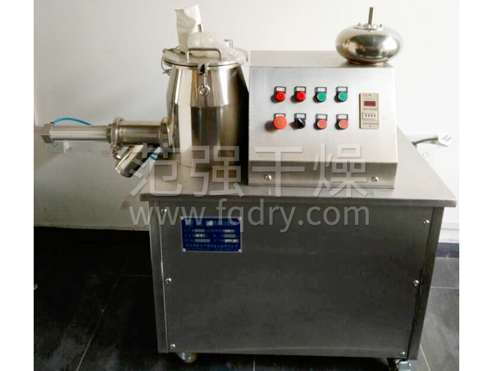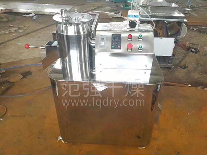 粉體物料與粘合劑在圓筒形容器中由底部混合漿充分混合成濕潤軟材,然后由側(cè)置的高速粉碎槳切割成均勻的濕顆粒。